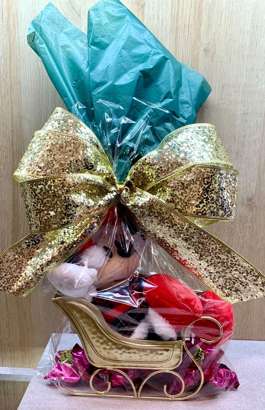 Na embalagem você receberá o trenó decorativo em metal dourado, um conjunto de bonecos infantis do Mickey em tecidos variados e o laço dourado com brilho para dar um toque final sofisticado e festivo.
