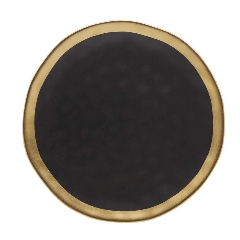 Este prato é feito em material cerâmico com superfície levemente ondulada no centro e borda em tom dourado. O modelo apresenta acabamento fosco que valoriza o visual requintado. Sua dimensão possibilita acomodar porções variadas, servindo bem diferentes preparos.